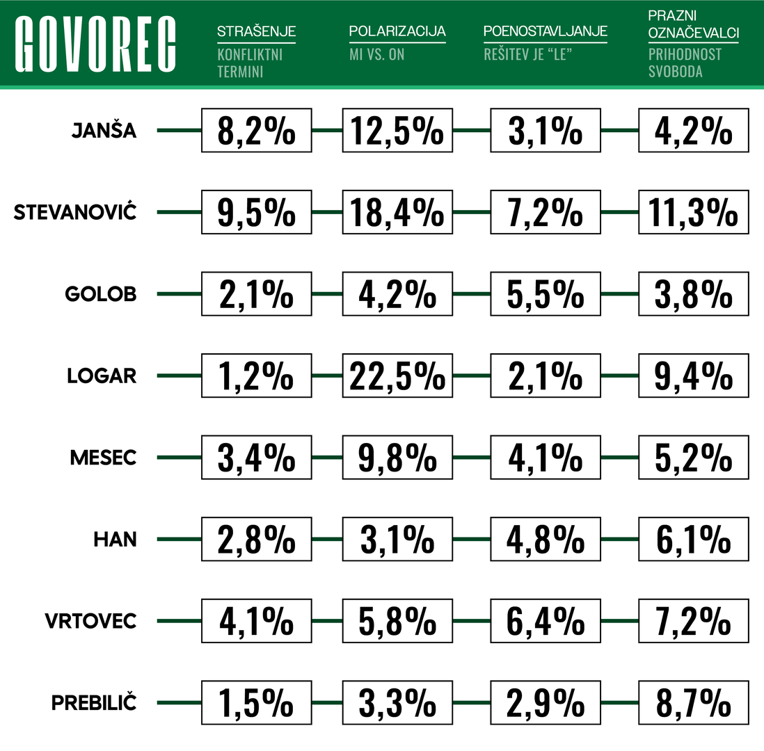 Janša ostaja mojster uporabe konfliktnih terminov. Njegova retorika je strateško usmerjena v vzbujanje občutka ogroženosti, pri čemer polarizacijo uporablja za utrjevanje lastnega volilnega jedra. Za razliko od Stevanovića manj poenostavlja, kar njegovemu strašenju daje videz "izkušene analize".