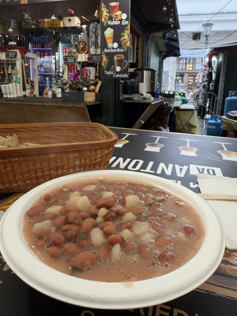 Ponudbe je toliko, da se človek samo čudi. In še preden nam je uspelo vse pregledati, nas je k pokušanju istrske jote prepričal natakar s fažanske stojnice Da Antonio, ki je tudi del ljubljanskega prazničnega sejma. Naj povemo, da so tu res mojstri prepričevanja, in če ste nekoliko bolj neodločni, kje se ustaviti in kaj pojesti, boste tako kot mi gotovo končali pri njih. Na srečo je bila njihova jota res izjemno dobra, tudi cena je bila ugodna - solidnih 6 evrov za zvrhan krožnik (brez klobase).