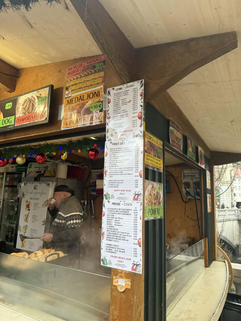 Nekaj korakov stran, v smeri proti Čopovi ulici, je še ena stara znanka prazničnih sejmov - stojnica Maketa z Okusi Ljubljane. Na tabli imajo navedeno, da se pri njih dobijo "slovenske narodne jedi", kulinarična ponudba je predstavljena tudi s fotografijami, kar je še posebej dobrodošlo za turiste.