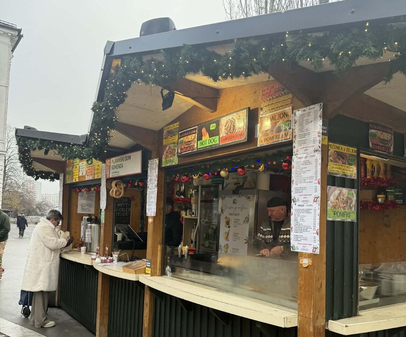 Če se bo vaše praznično pohajkovanje začelo na Prešernovem trgu, boste hitro ugotovili, da čevapčiči in pleskavice tudi letos na tem mestu ostajajo stalnica: tik ob Tromostovju jih pečeta in postrežeta oba ponudnika, Saraj in Planinski dom Komenda, ki že zelo dolgo sodelujeta na ljubljanskem sejmu.