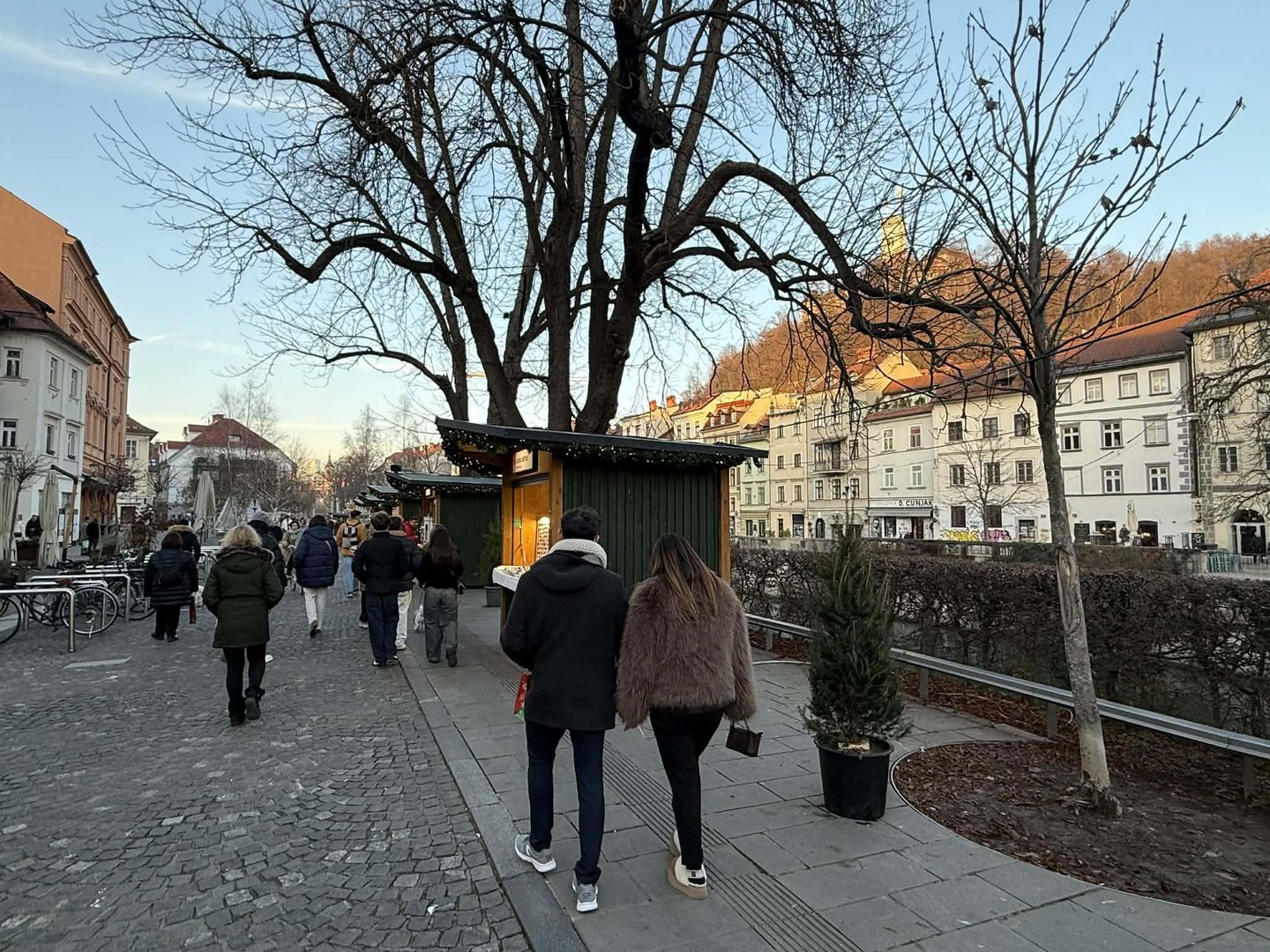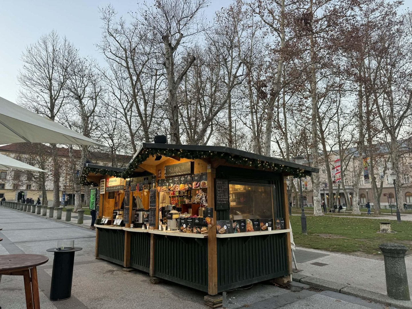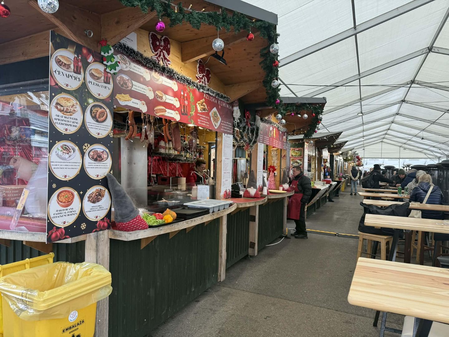 Na mestu, kjer se v toplejših mesecih odvija kulinarični festival Odprta kuh'na, je v decembrskem času prava veselica. Druga zraven druge se nizajo lesene hiške, iz katerih njihovi ponudniki mimoidoče vabijo, da se tu ustavijo in kaj poskusijo. Tudi tu čevapčiči in pleskavice sestavljajo velik del ponudbe, ob tem imajo še giros ali kebab, pa kotlete, golaž, girice in ocvrte kalamare.