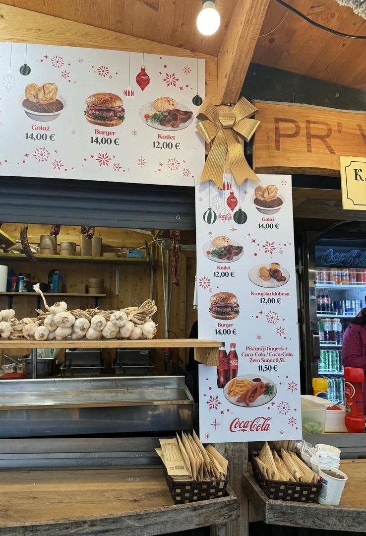 Pri slednjem boste poleg čevapčičev (13 evrov) in pleskavice v lepinji (11 evrov) lahko naročili tudi pečenico z zeljem (11 evrov), hot dog (5 evrov), klobaso (9 evrov), medaljon s krompirčkom (10 evrov), hamburger (10 evrov) in krompirček.