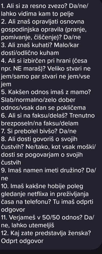 Te dni pa se je na slovenskem Redditu oglasil moški, ki je delil sporočilo, ki ga je še posebno šokiralo. Neko dekle, s katerim sta na aplikaciji Tinder drug drugemu poklonila všeček, zato se jima je odprla opcija za pogovor, mu je, še preden bi lahko začela resno debato, poslala pravi pravcati anketni vprašalnik.