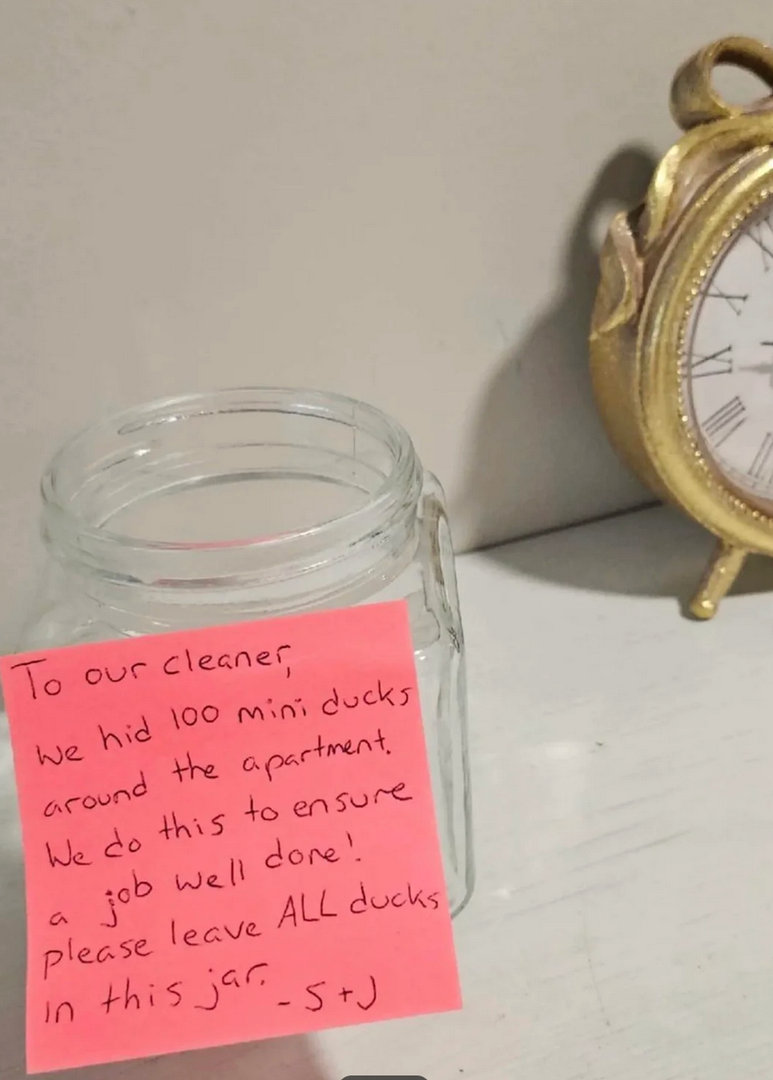 "Draga čistilka, po stanovanju sva skrila sto majhnih račk. To sva naredila, da bi se prepričala, da bo delo dobro opravljeno. Prosim, če po koncu čiščenja pustite čisto VSE račke v tej skledi. Z lepimi pozdravi, S in J."