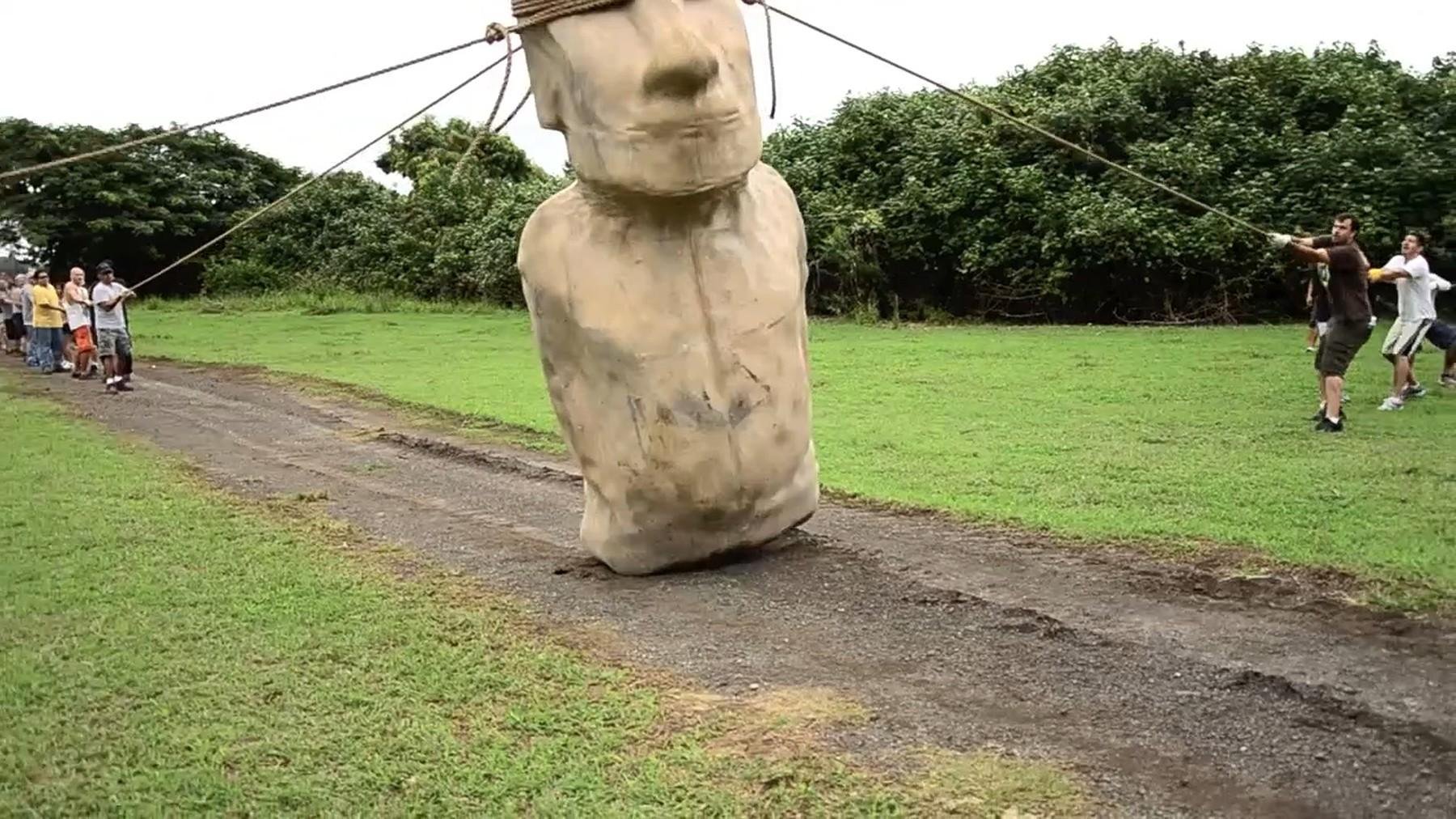 Da bi teorijo preverila v praksi, sta znanstvenika izvedla izjemen eksperiment. Z ekipo 18 ljudi jima je s pomočjo vrvi uspelo "sprehoditi" 4,35 tone težek kip na razdalji 100 metrov v manj kot uri. S tem sta dokazala, da bi starodavni prebivalci otoka lahko kip premikali pokončno, z zibanjem levo-desno, brez uporabe lesenih sani ali drugih pripomočkov.