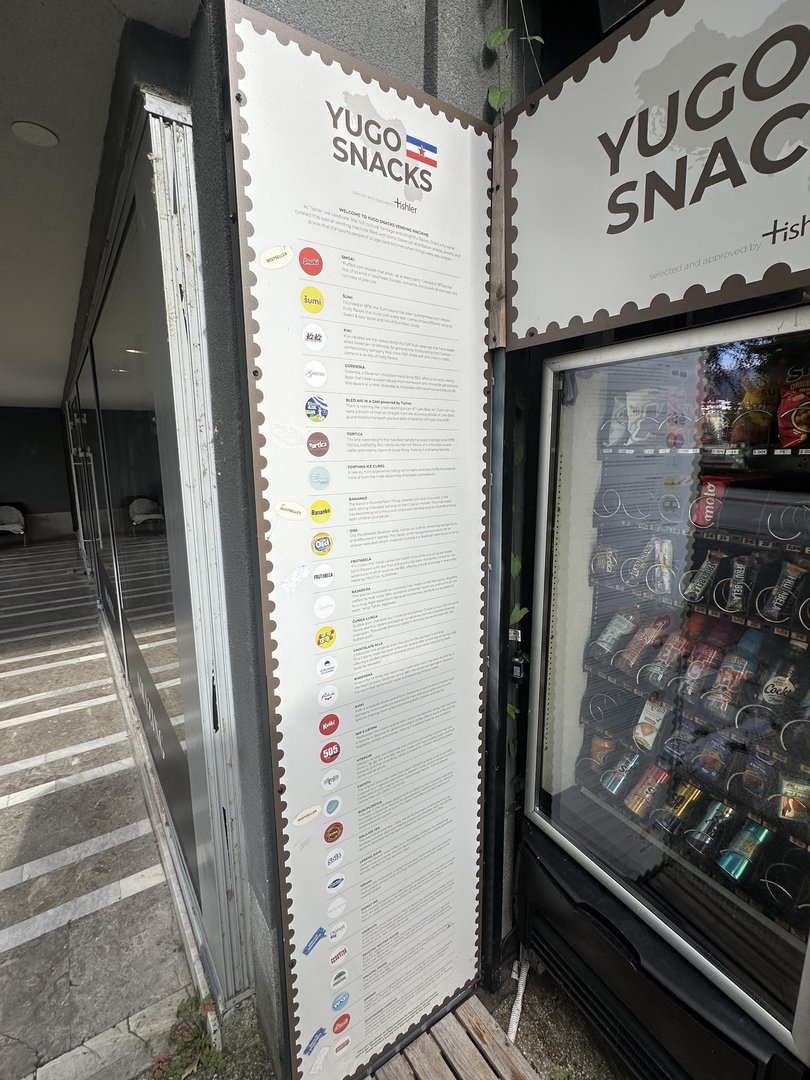 Domiselno poimenovan Yugo Snacks je avtomat prava kapsula nostalgije, saj se v njem znajdejo legendarni izdelki, kot so Smoki, Frutabela, čokoladno mleko Ljubljanskih mlekarn, bonboni Ki-Ki, Cedevita, pa tudi manj znani biseri, na katere so ljubitelji retro prigrizkov morda že pozabili (bonboni 505 s črto, Tortica, Rum ploščica, Vitergin ...). Vsi produkti so tudi navedeni na tabli ob avtomatu in predstavljeni skozi kratko zgodovino.