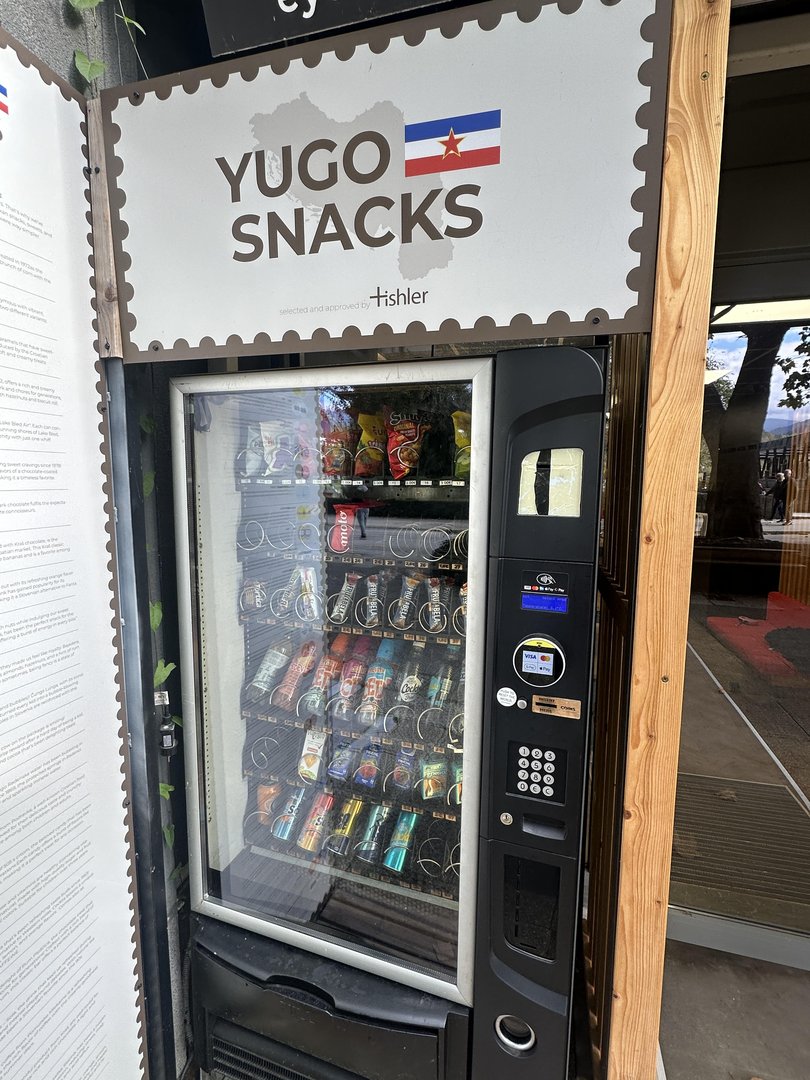 Tako se med sprehodom ob Blejskem jezeru lahko ustavite ob nečem, kar ni ravno tipično turistično doživetje – avtomatu s prigrizki, ki namesto čokoladic Snickers in Twix ali sendvičev ponuja prigrizke iz časa nekdanje Jugoslavije.