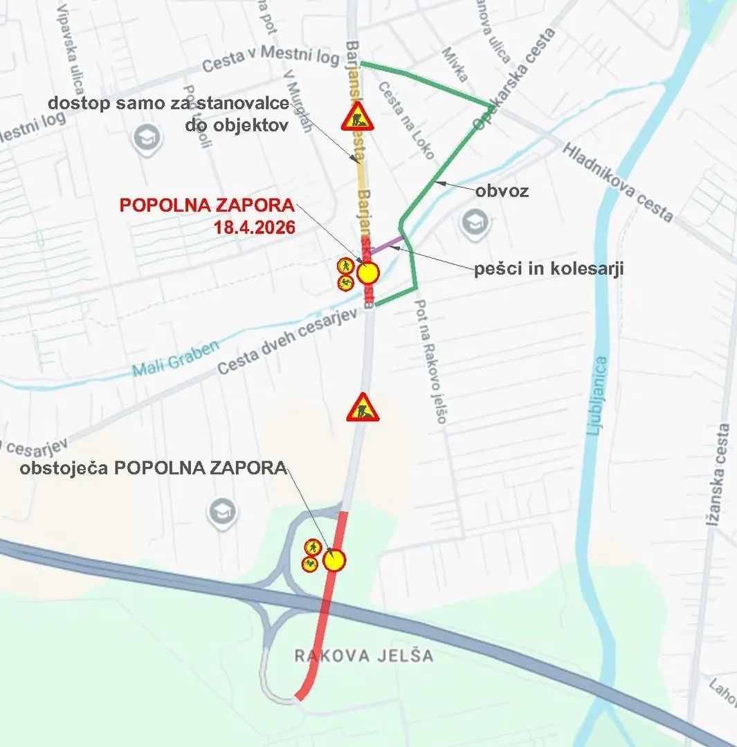 Za lokalni promet bo dostop do objektov na delu od Ceste v Mestni log do Barjanske 80 mogoč iz severne strani. Obvoz bo urejen po Kopačevi in Opekarski cesti, Poti na Rakovo jelšo in Cesti dveh cesarjev, so na mestni občni zapisali v sporočilu za javnost.