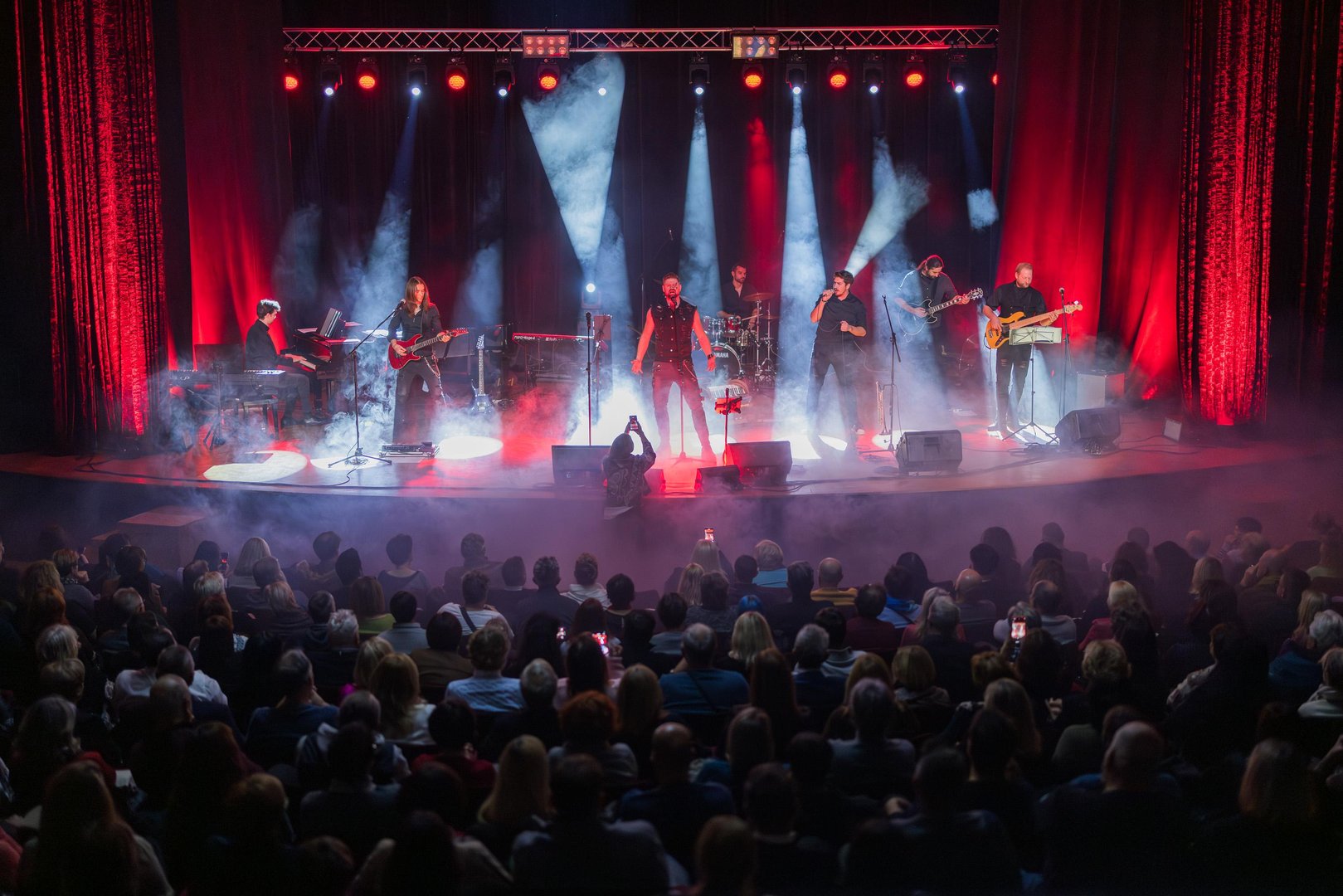 Oder je bil zasnovan kot poligon za glasbeni presežek. Tri kitare, trobenta, harmonika, bobni, klavir in klaviature – razporeditev, kot bi jih pričakovali v rock operi, ne pa v slovenskem obalnem kulturnem hramu. A ravno ta neobičajni spoj je pomenil začetek večera, ki je iz minute v minuto bolj dihal kot celovit show, ne le kot niz skladb.