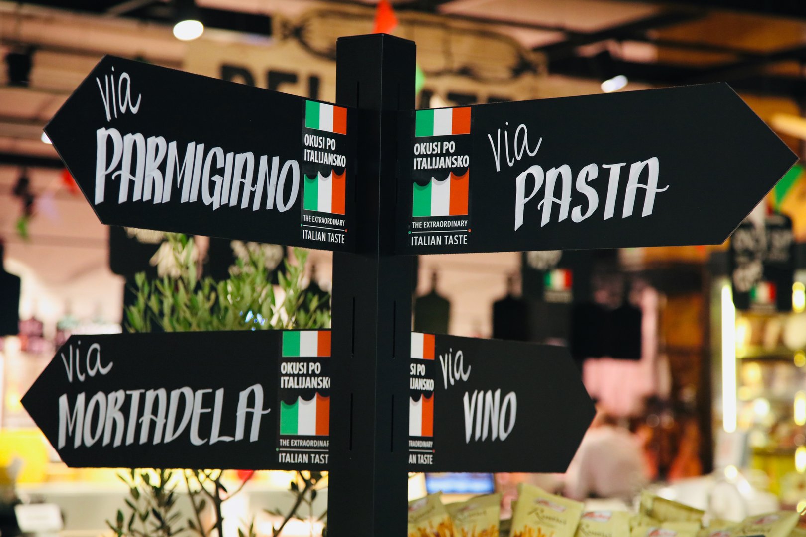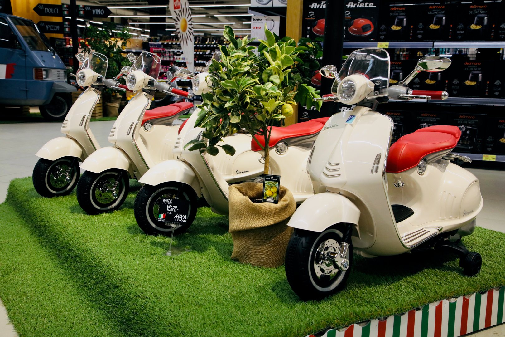 Ko se naslednjič podate v supermarket ali hipermarket Mercator, le sledite italijanskim zastavicam. Mi smo v hipermarketu Šiška v Ljubljani sicer raje sledili kar številnim Vespam, ki igrivo pozdravljajo prihajajoče kupce. Ena teh je namreč tudi glavna nagrada v spremljevalni nagradni igri. Lahko pa le zaupate nosu - če deluje kot mora, vas zna pripeljati kar na degustacijo katere od italijanskih dobrot.