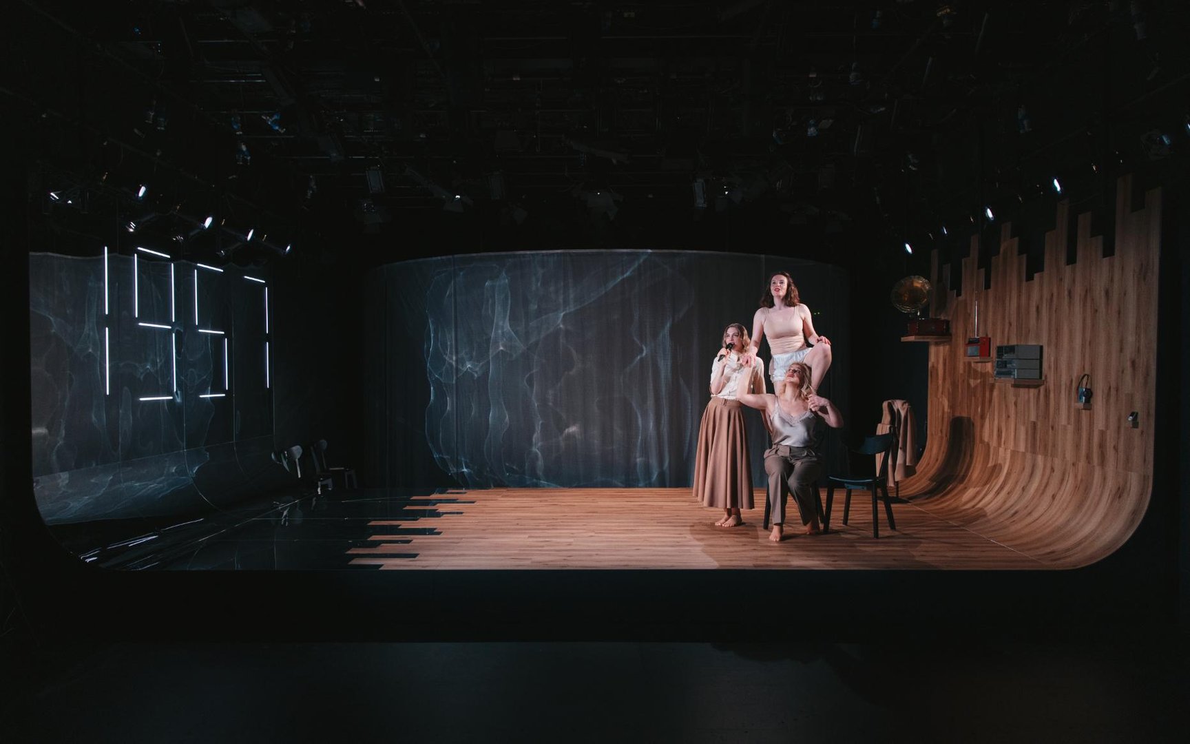 Scenograf Darjan Mihajlović Cerar si je oder zamislil na koordinati spomin-minevanje časa, dodal pa je še nekaj motivov, s katerimi je obogatil prostor, ki ga naseljujejo liki. Kostumografinja Jelena Proković pa je pri iskanju kostumov iskala skupne točke med različnostjo in enotnostjo. Izbrala je klasične kose oblačil, ki so brezčasni, ter jih poenotila v barvah in s sceno.