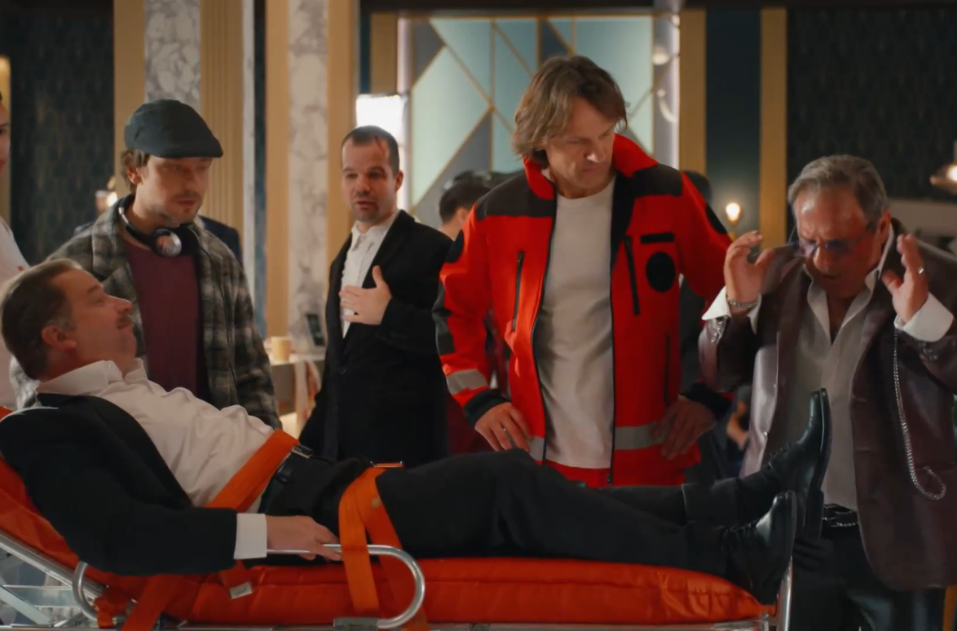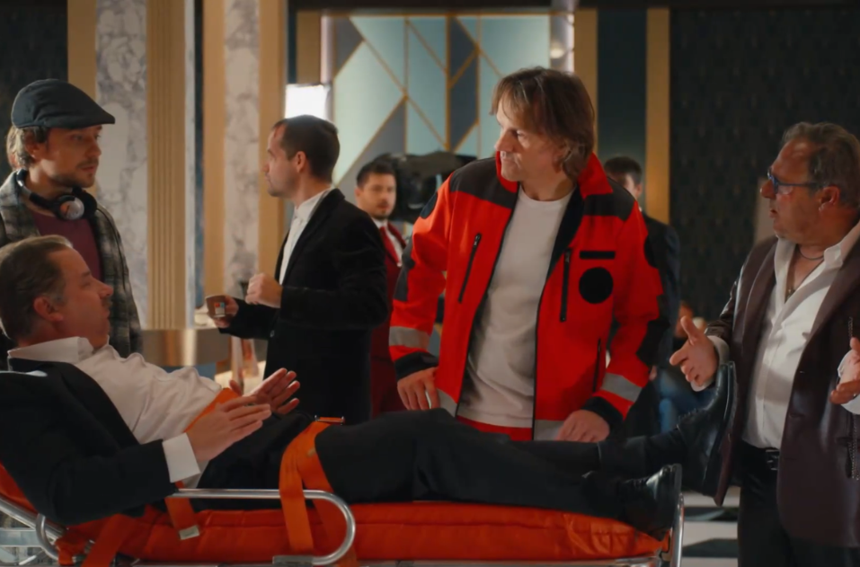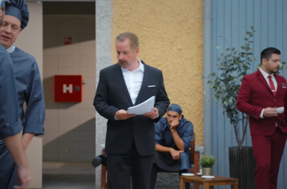Epizoda gledalce popelje v posebno vzdušje, saj se restavracija za nekaj časa spremeni v snemalno prizorišče. Rudi namreč snema film, njegov filmski partner pa je prav Usenik. A v zgodbi se zgodi nepričakovan preobrat – na dvorišču hotela se pripravljajo na nogometni turnir med kuharji in natakarji. Usenikov lik doživi nesrečo, ko nerodno stopi na žogo, pade in se huje poškoduje. Na prizorišče mora priti celo reševalno vozilo, poškodovanega igralca pa nadomesti nihče drug kot Chef, ki ga igra izjemni Jurij Zrnec.