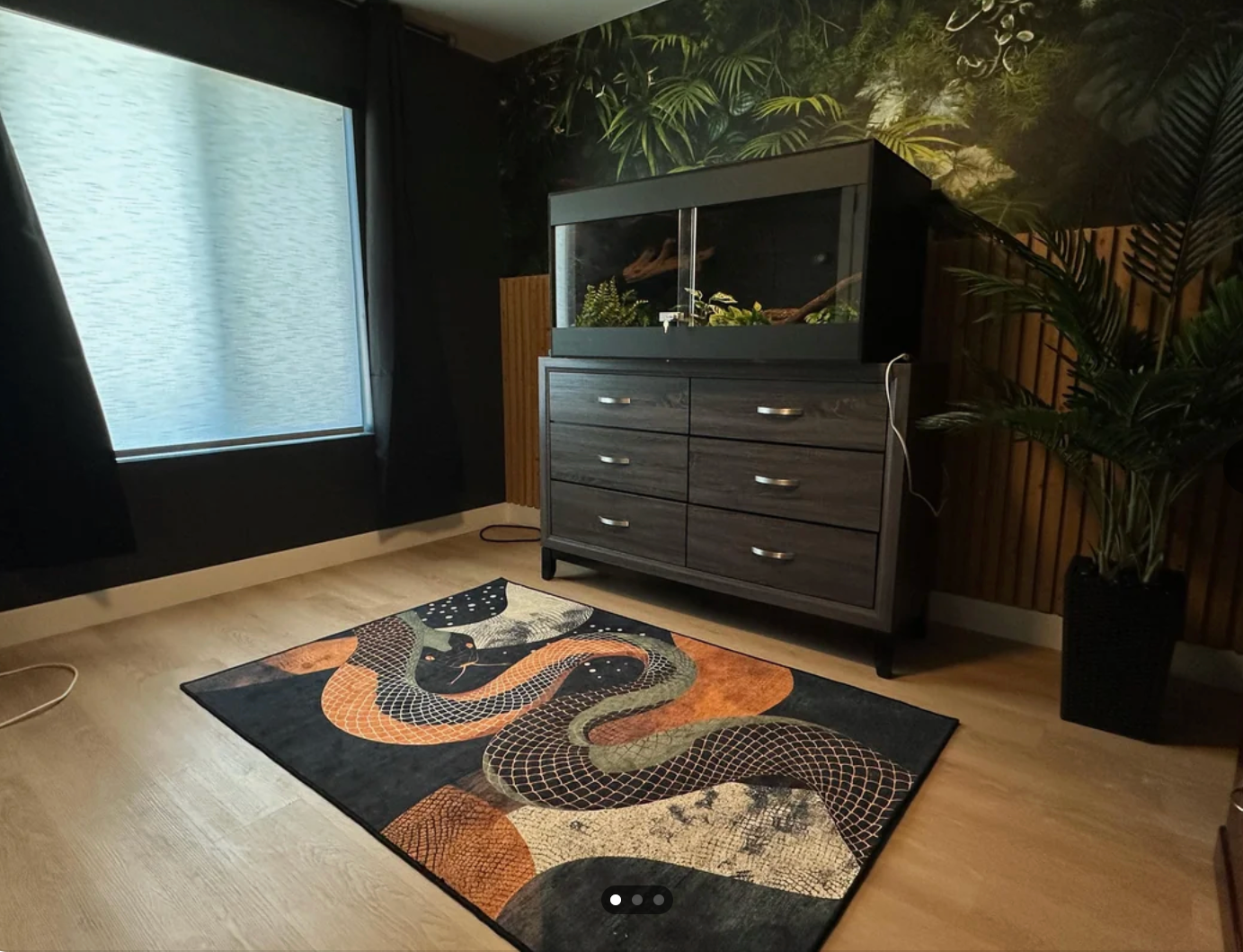 Fotografije, ki jih je na Redditu delil Chase, prikazujejo temno, elegantno urejeno sobo z nekaj tropskega pridiha. Na sredi stoji črna komoda s steklenim terarijem, v katerem prebiva Harper, kača, ki jo je Chase dobil januarja letos. Ob terariju je celo preproga z vzorcem kačjih lusk, ki lepo zaokroži vzdušje v sobi.